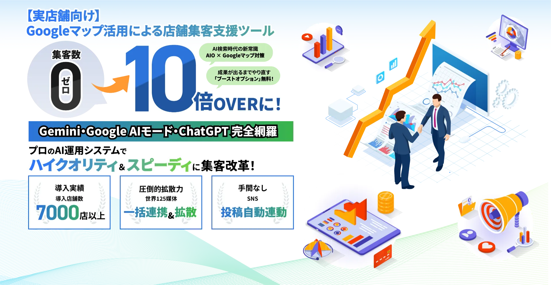 「ツールを導入して終わり」「毎月レポートを出すだけ」の業者とは違います。弊社は成果(集客増・売上増)に徹底的にこだわり、万が一思うような結果が出ていない場合は、実績1,000社以上の有識者が分析を行い、施工を「1」から何度でもやり直す『ブーストオプション』をご用意。この圧倒的な伴走体制とコストパフォーマンスが、多くのお客様に選ばれる最大の理由です。