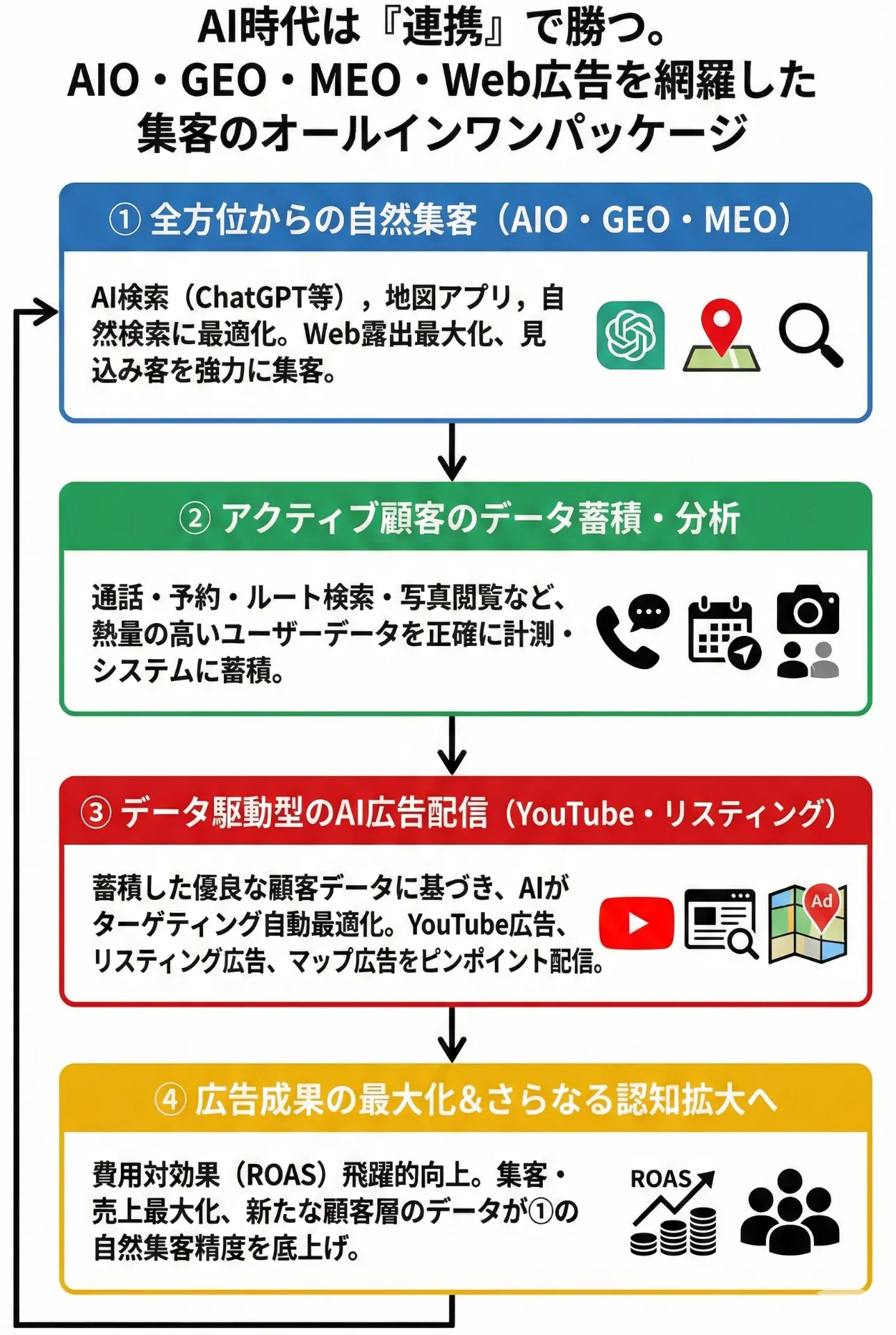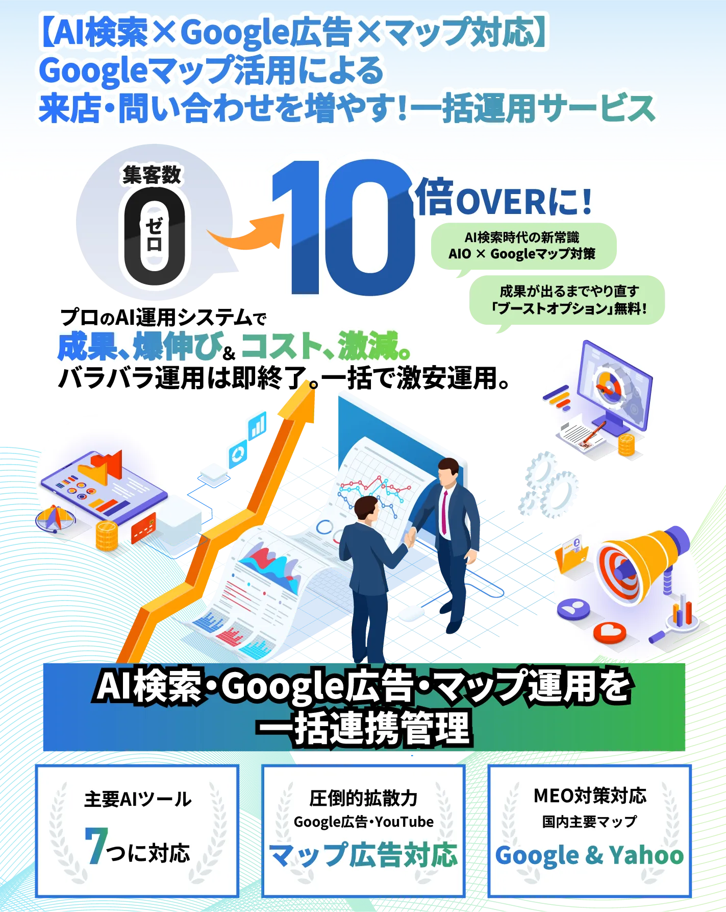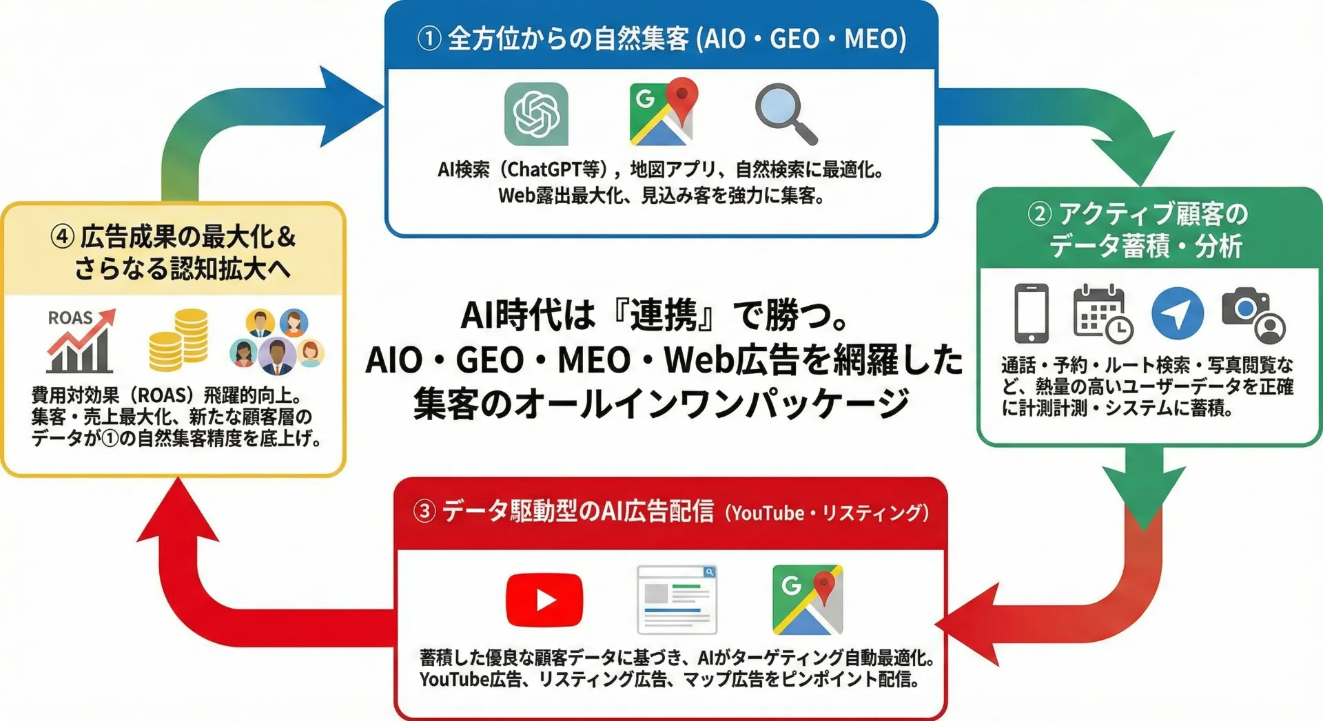 AIが貴店情報を学習し、YouTube・マップ・リスティング広告を最適化。付帯広告サービスで成果を劇的に変えます。