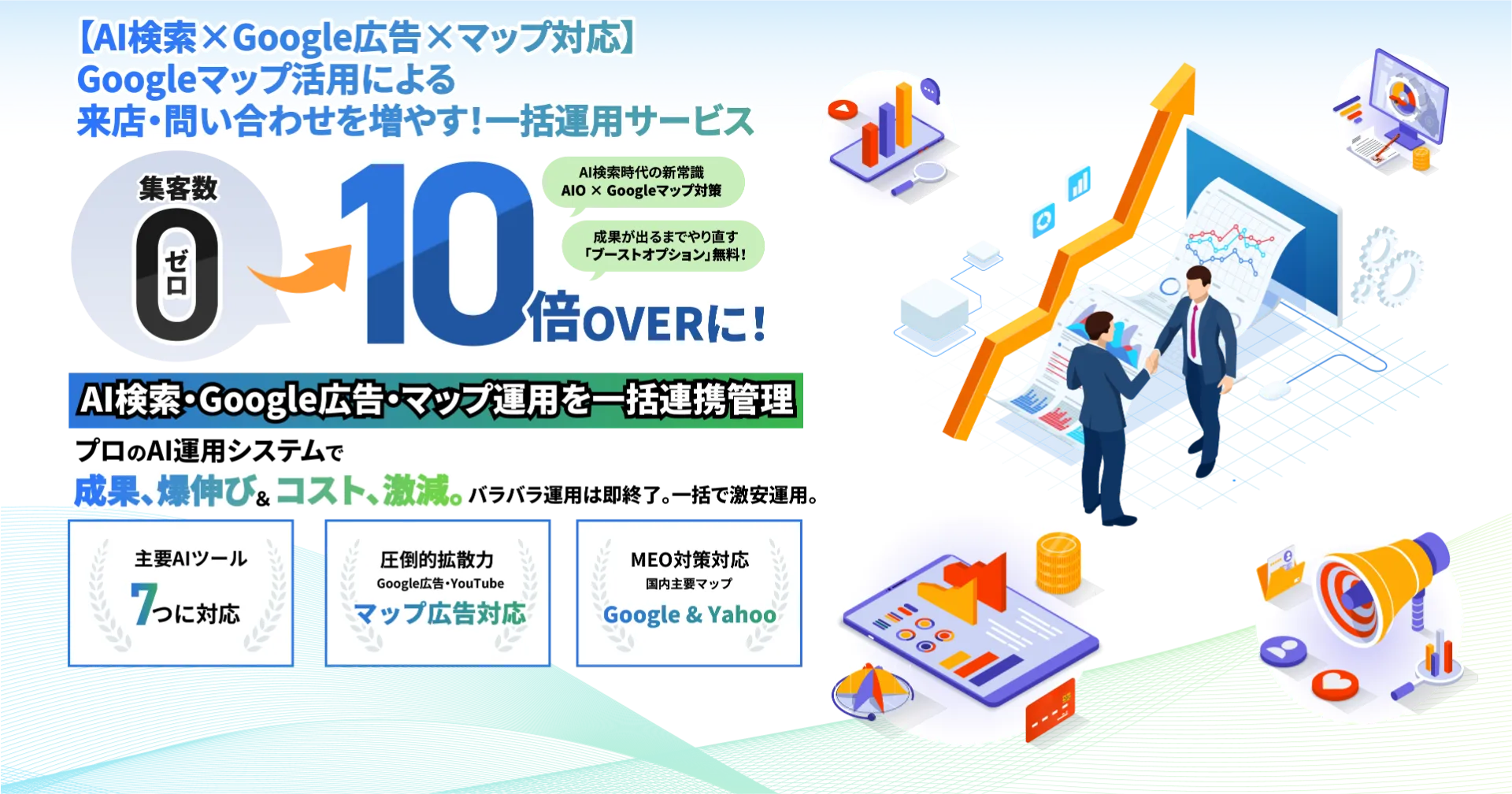 自社開発による徹底したコストカットで、市場価格数十万円するAIO・GEO・MEO・Google広告を圧倒的コスパで提供。