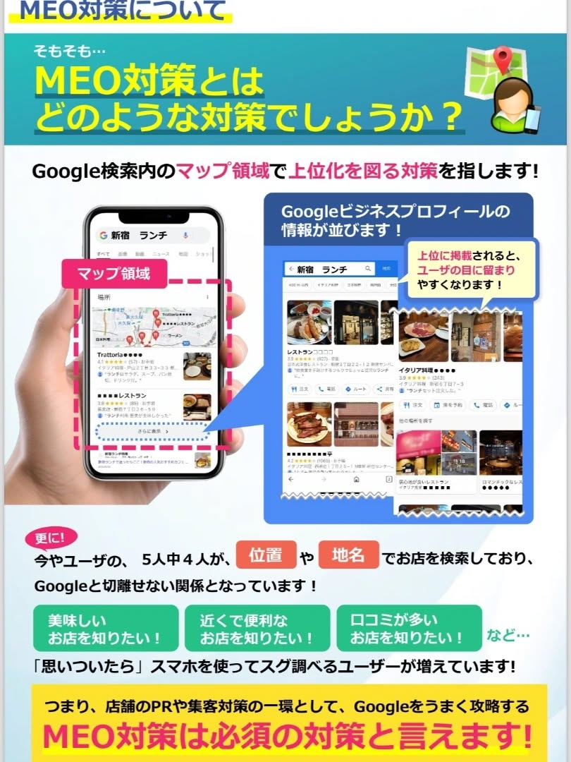LLMO×MEO対策 サービス概要現代の店舗探しの 変化に対応したMEO戦略お店を探す人のうち5人のうち4人がGoogleマップ検索をしています。さらにこの検索をしたあと34%もの人が 24時間以内に店舗を訪問しています。店舗集…
